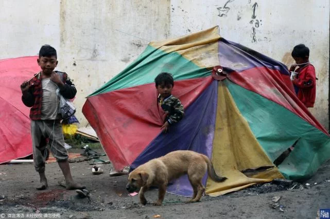 下雨的时候,乞讨的儿童在破旧的伞下躲雨。