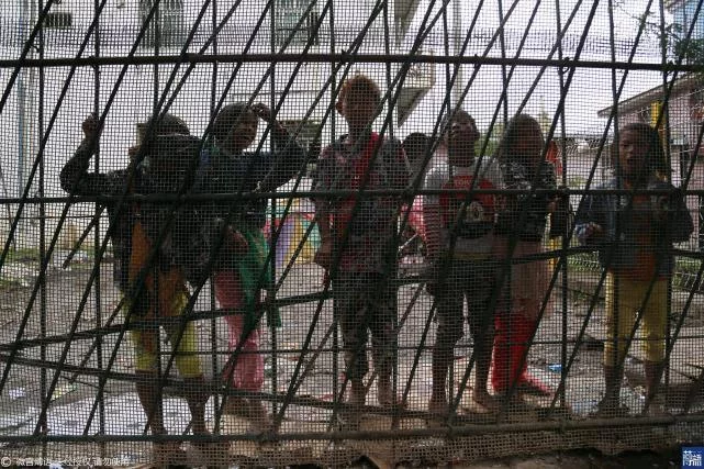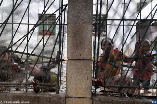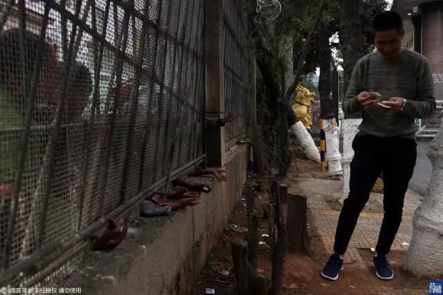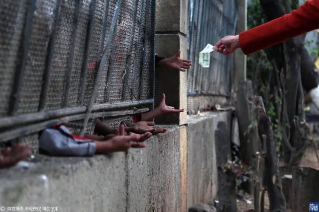 一名国内游人因为在栅栏出递给孩子5元钱, 其他的孩子们翻过栅栏抱着游人的胳膊继续乞讨。