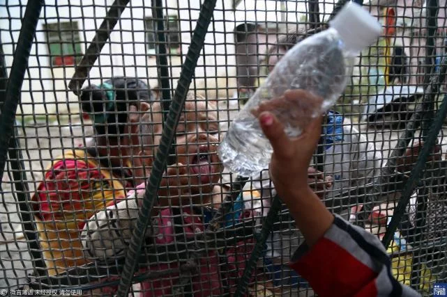 小男孩拿着乞讨的矿泉水隔着栅栏给其它乞讨孩子解渴。