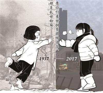 “那年乱世如麻,愿你们来世拥有锦绣年华”。昨日,这句话被许多网友转发提及,这句话来自于一张漫画图,图中两名分别来自1937年和2017年的女孩隔空相对,一人身边战火纷飞,一人身处和平现代。这幅图的作者朱彦告诉北京青年报记者,该图创作于去年12月,今年有网友把原图中的2016年换成了2017年,之所以想要画这张图,是因为想让大家不要忘记这段历史,而网友的大量关注在他们意料之外,“说明我们想表达的情绪网友感受到了。”