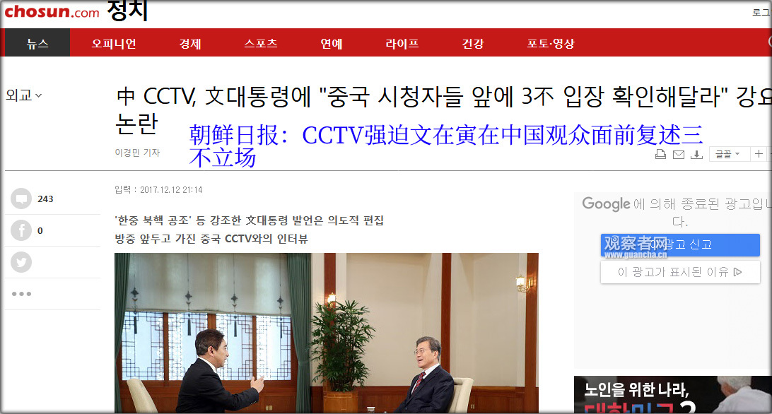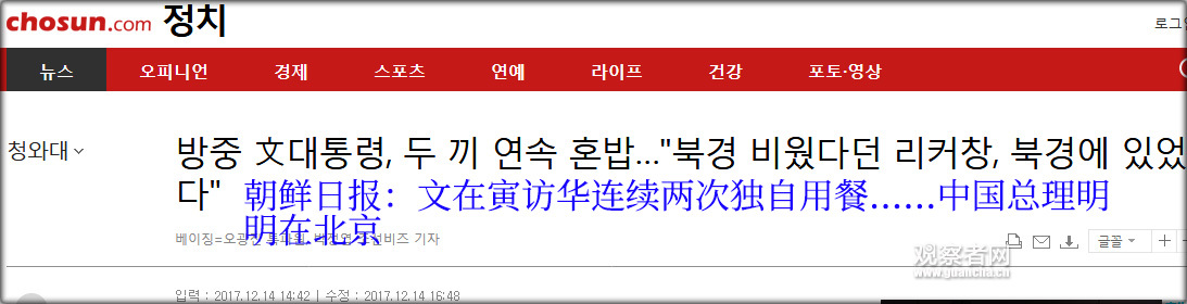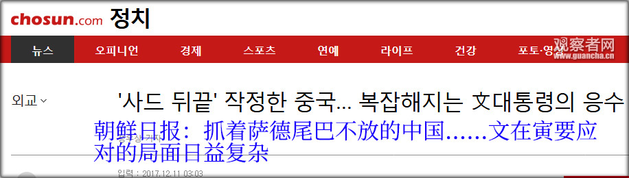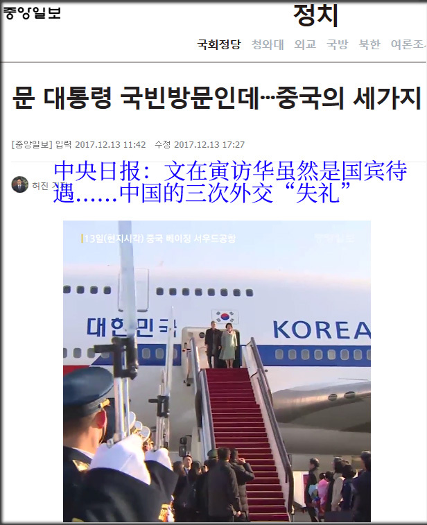 早在文在寅登上前往北京的专机之前,以《朝鲜日报》为首的韩国保守派媒体就开始抓住一切细节炒作文在寅访华之旅困难重重。11日,《朝鲜日报》就称中国在反复强调韩方的“三不”承诺,这是在向韩方施压,不符合韩方要求将萨德问题“封印”的愿望。