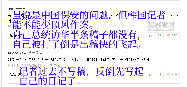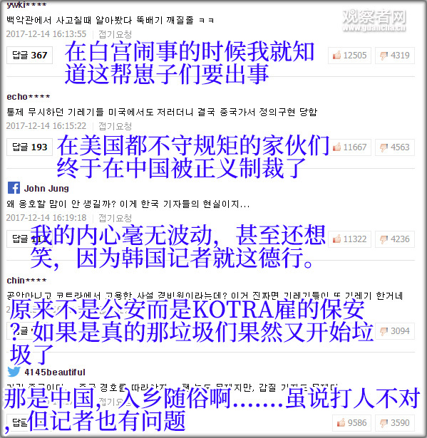 首先是韩国保守派媒体热炒的记者被打事件,尽管韩国各路媒体都对此做了铺天盖地的报道,还要求中国公开道歉,但韩国网民却做出了不一样的反应: