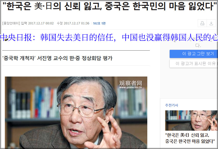 而韩国《中央日报》在今天发的《韩国失信于美日,中国也未能赢得韩国人民的心》一文也是碰了一鼻子灰。