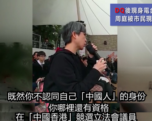 有市民现场发言时,质问周庭既然她不认同自己"中国人"的身份,又何来资格在"中国香港"竞选立法会议员?与此同时,该市民请周庭今后不要再妄言"代表香港人",因为她代表不了包括该市民在内的绝大部分香港人。