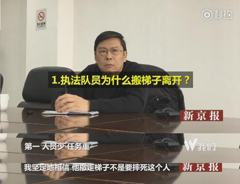 2月1日,在航空港区综合执法局内,港区管委会党政办副主任李自强就城管撤梯事件给予最新回应。他称,事发时,6名城管执法人员在现场停留40多分钟后,因还有其他执法任务,便将梯子暂扣带走,并当场履行了告知还梯的义务。"据我了解,之前城管执法时并无此类处置操作,但撤走梯子不是想摔死这个人。退一步说,30岁的人了,也应该有安全意识。"(来源:新京报)