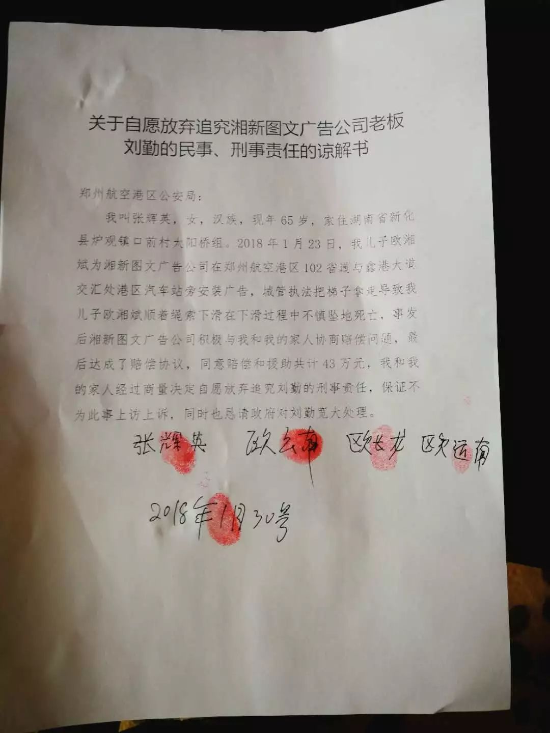谈判结果很快拟定:"'湘新图文广告'负责人赔偿和援助死者家属共计43万元,死者家属自愿放弃追究刘勤的民事、刑事责任,并在谅解书上签字。(来源:新京报)