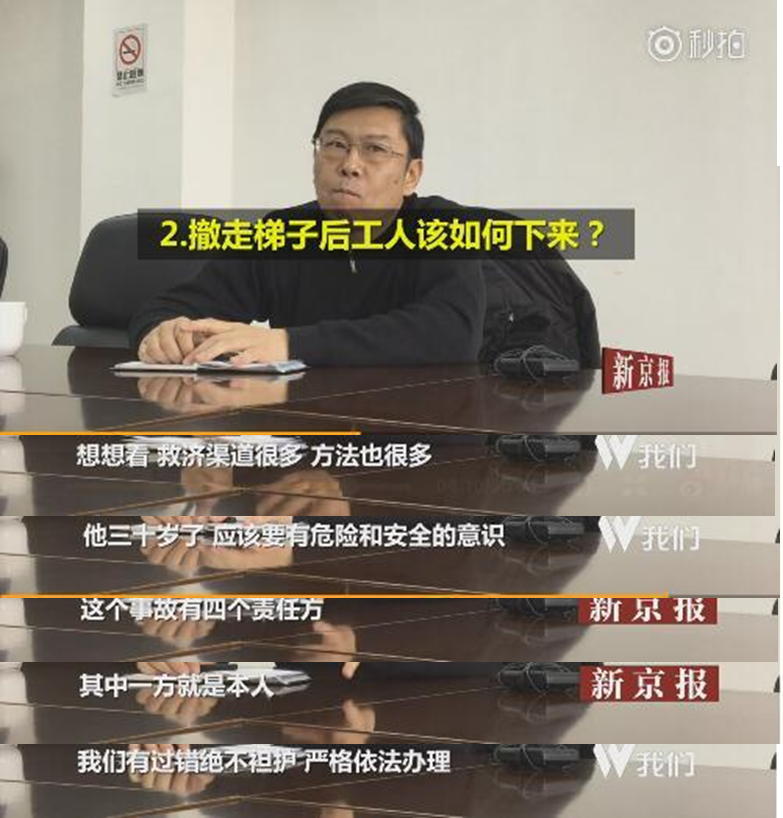 中国政法大学教授 王敬波:整个行为所表现出来的是非常专横,非常简单粗暴,完全没有估计到行为人正在拆除这样的一种事实,也没有充分地考量到,梯子撤走了当事人怎么下来,这样的一个关乎安全的一个问题。
