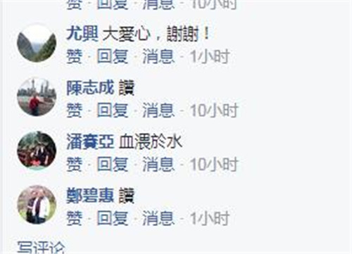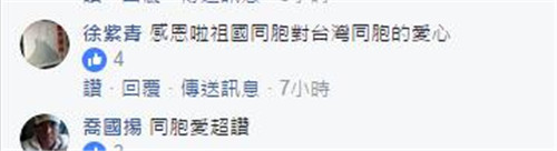 对于来自大陆同胞的支持和关心,台湾同胞在facebook纷纷点赞表示“血浓于水”“同胞之爱超赞”“感恩祖国同胞对台湾同胞的爱心”“本是同根生,谢谢你们”。