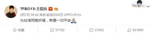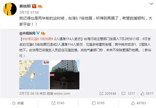地震发生后,黄晓明、TFboys等明星们均在微博中为花莲灾区民众祈福,表示“愿大家平安”。