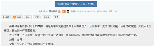 花莲地震,牵动着大陆同胞的心,不少大陆网友在网络社群号召赈灾,许多人表示要捐钱“跨海送暖”。截至8日22时,微博阅读量已达1.8亿,讨论量43.7万。大陆网友纷纷祈福,为台湾加油,愿花莲人民平安。