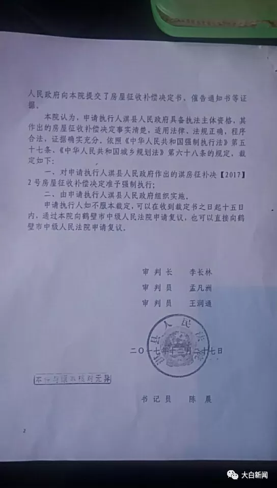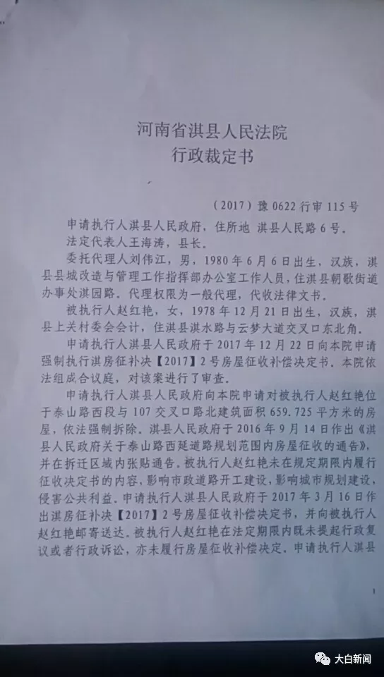 今天(2月11日)下午,大白新闻记者联系到淇县拆迁办主任郭某,对方表示,此拆迁行为是有法院裁定书的,属于强制执行行为,并提供了《河南省淇县人民法院行政裁定书》相关文件。