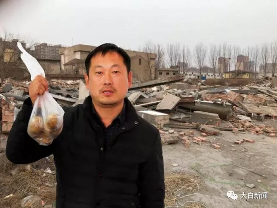 该居民称自己名叫袁鹏利,家住河南省鹤壁市淇县,腊月二十四日傍晚,自己去菜市场买了三个土豆,路遇放假归乡的朋友,于是聚在一起吃了顿晚饭。晚上回家时发现自己的房子被强拆,成了一片废墟。