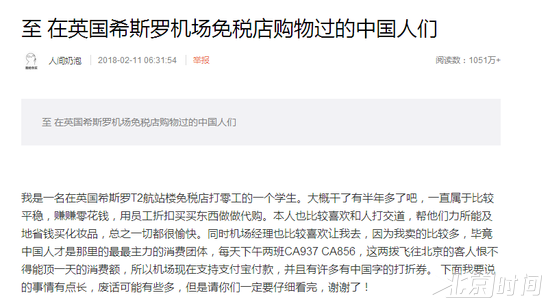 11日,题为“至 在英国希斯罗机场免税店购物过的中国人们”的文章在微博上刷屏。文章作者曝光称,发现机场第二航站楼的免税销售区域,在没有任何书面说明的前提下,要求中国消费者在机场消费1000英镑之后,才有资格领取第二次消费时可以使用的八折优惠券,而此前只需要消费250-500英镑。更令人气愤的是,1000英镑的标准只针对“飞往中国的顾客”,而如果是外国人想得到此优惠券,只需要消费79英镑。