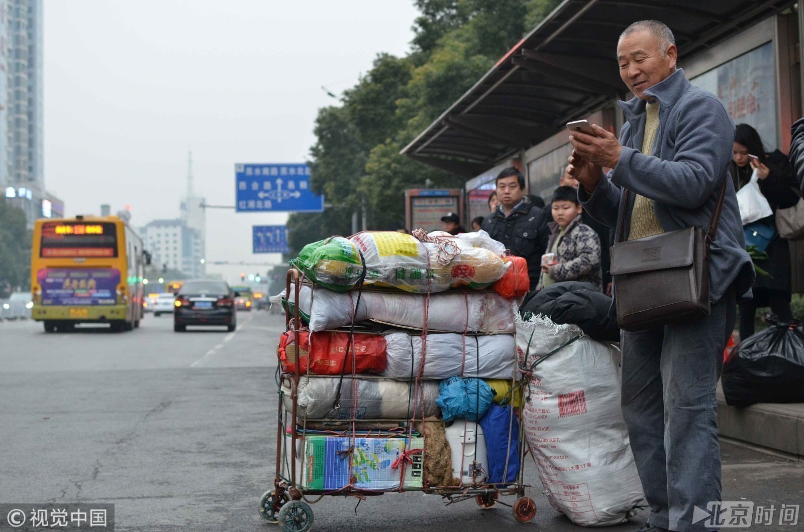 老人不想麻烦家人,也不通知家人来接站,下火车后选择搭公交前往儿子家,据老人说火车站到儿子家打车也就起步价(8元钱)。老人与儿子联系时,等候公交车的市民也被大叔的行李所吸引。