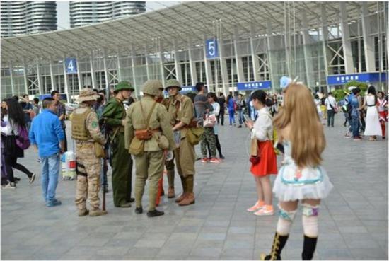 2015年成都漫展上,几名"精日"军服迷身着旧日军军服入场。
