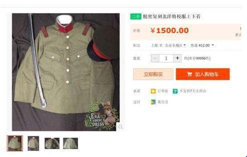 环环在淘宝网上输入"日军军服",搜索结果基本全是几十到上百元的廉价戏装,没有孟先生所说的那种昂贵服装。"这些都是卖给影视公司的",钟爱华说,"不妨换个关键词,比如'北洋军服''将校服'。"果然,在买卖二手商品的"闲鱼"App上,记者搜到有卖家卖二战日军的原品军服,一套军帽、大衣、上衣、马裤、马靴标价2.6万元。有意思的是,从商品名到介绍,竟没出现"日军""日本"等词。