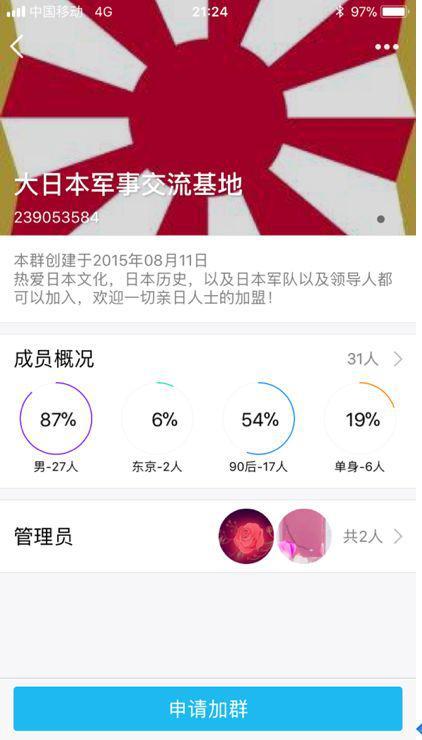 在QQ群查找功能里,输入"武运长久""东亚共荣"等关键词,能搜出数十个相关结果。除去一些"人烟稀少"的"荒群",有些群介绍之翔实令人吃惊。一个名为"大日本军事交流基地"的群赤裸裸地注明:"热爱日本文化,日本历史,以及日本军队以及领导人都可以加入,欢迎一切亲日人士的加盟!"(原文如此)然而,当环环尝试提交入群申请,却被提示"该群群主拒绝添加任何新成员"。