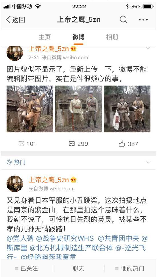 "他们开始人肉我,威胁我的家人了。"两天前,福建的孟先生给环环发来微信。他的微博账号名为"上帝之鹰_5zn",是去年"四行仓库日军军服合影事件"和本次"紫金山日军军服合影事件"的爆料人。对普通人而言,"精日"难以触及,而孟先生则身处曝光"精日军服迷"的第一线。
