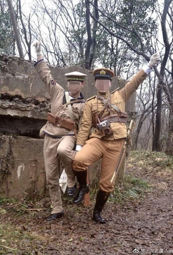 日前在南京抗日碉堡遗址前身穿仿制二战日本军服拍照的两名男子。