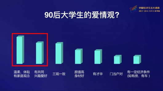 都说年轻人是一个国家的未来,那现在的90后、大学生都在想些什么,你知道吗?是像很多人认为的啥都不在乎,有些任性吗?他们喜欢什么,关注什么?《中国经济生活大调查(2017-2018)》针对18-25岁的在校学生进行了专项调查,他们大多数都是90后,结果还是有些出乎意料的。有趣的是,在择偶的考虑要素中,他们眼中排在第一位的是温柔、体贴、有家庭观念,超越了颜值、才华,甚至家庭和经济条件。90后大学生对于自己的另一半,看重的原来是这些,你想到了吗?>>详细