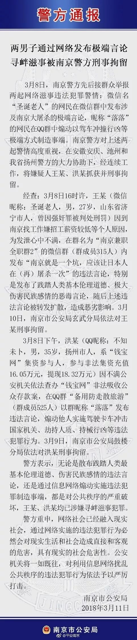11日下午,南京市公安局官方微博@平安南京发布警方通报,两名男子通过网络发布极端言论寻衅滋事,被南京警方刑事拘留。其中,微信昵称为“圣诞老人”的男子因在微信群中发布“南京就是一个坑,应该让日本人在(再)屠杀一次”的违法言论,10日被南京警方刑事拘留。