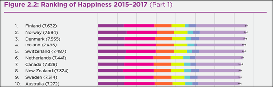 这份报告统计了2015年到2017年全球156个国家和地区的所谓“幸福”指数,综合人均GDP、社会支持(来自亲朋好友在必要时的支撑)、寿命预期、自由选择权(freedom to make life choices)、慷慨(generosity,注:即居民是否曾经捐款)、政治清廉程度。