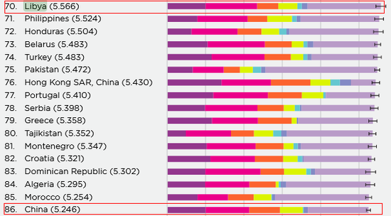 每年3月20日是“世界幸福日”。在这个特殊的日子到来之前,联合国连续第六年发布了《世界幸福报告》,“量化”了世界各国民众的幸福指数。中国大陆今年排86位,比去年(79)略有下滑。除了中国大陆以外,今年中国台湾地区排名第26,香港地区排名第76位。但是,名次在中国之前的国家居然有利比亚(70)?
