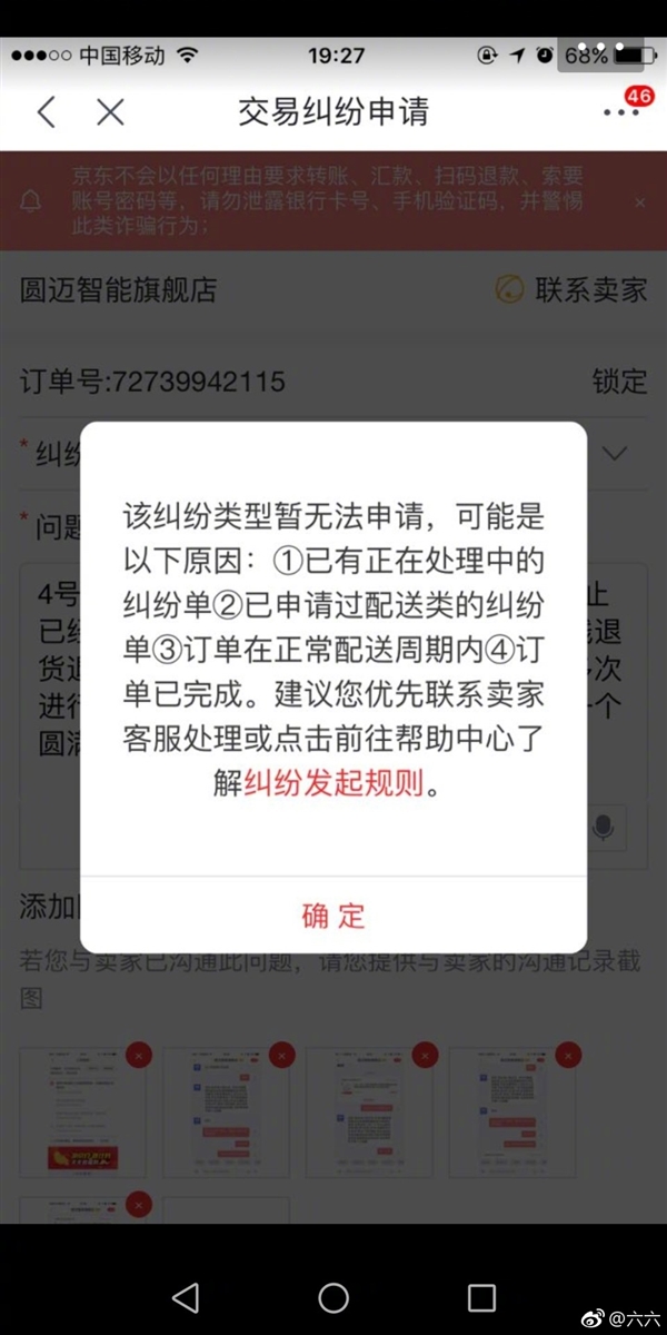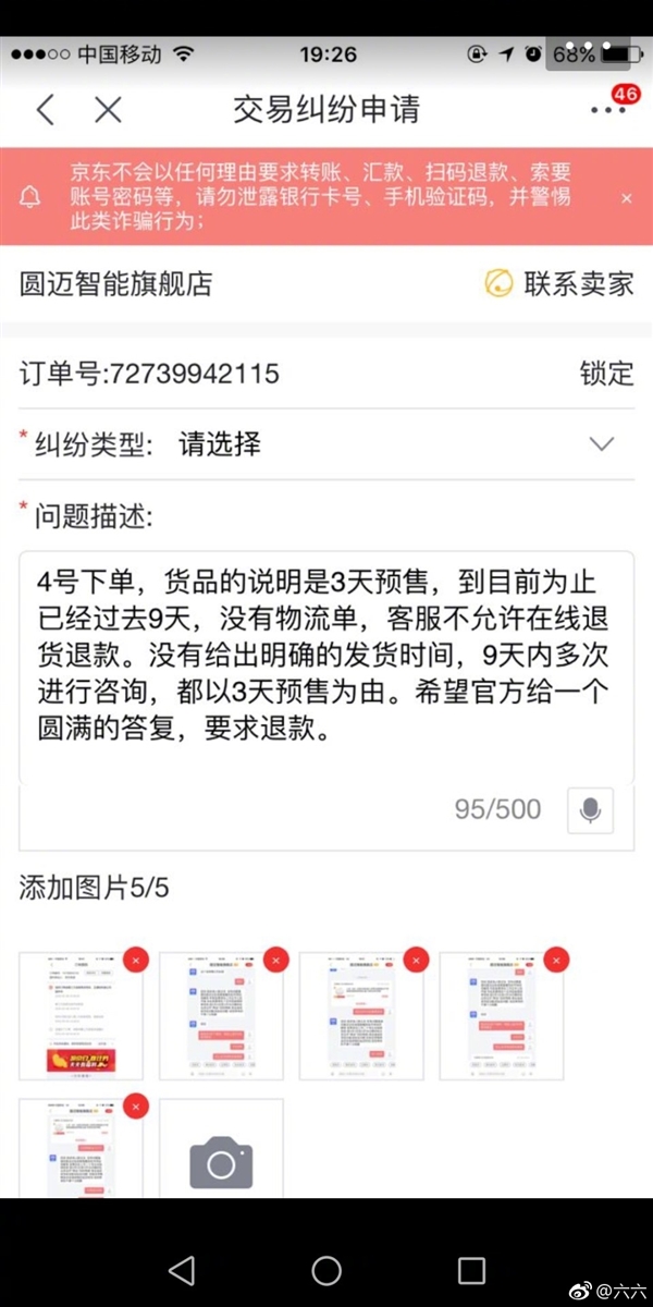 六六通过个人微博、微信,公开发表《无赖京东》一文,称在京东全球购平台上购买了美国Comfort U护腰枕,标价人民币1489元,美国官网售价109.95美元,但收到的产品标识却是Contour U,美国官网售价近33.6美元。