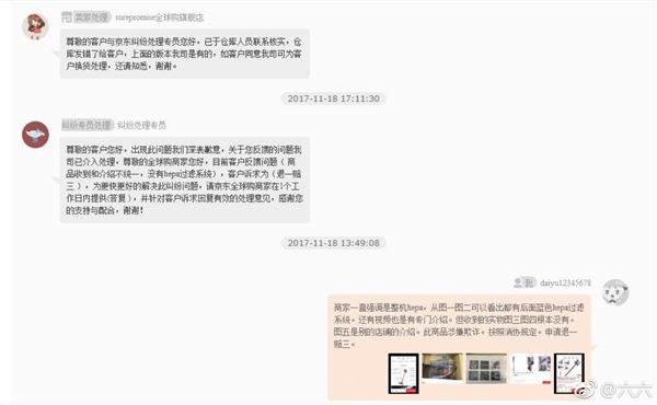 六六称,在投诉后,京东客服态度蛮横,拒假一赔十,只能退货退款,而且甚至篡改数据,修改了其与商家的沟通记录。