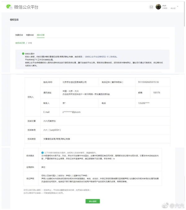 京东认为,六六在没有经过充分调查了解的情况下,仅凭其朋友的叙述和一面之词,就公开发布言辞激烈、与事实出入较大、存在恶意诋毁的文章,并造成大范围传播,已经严重侵害了京东平台的信誉。
