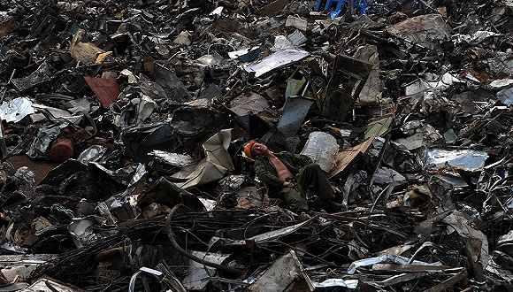 2011年9月9日,浙江台州椒江港内,一名工人守着小山般的“洋垃圾”酣然入梦。图片来源:视觉中国