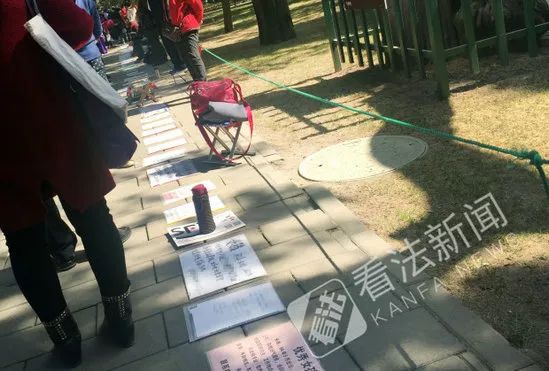 3月25日,已有不少家长来到中山公园"摆摊"。大家从家里带来马扎,把征婚简介塑封好摆在地上,一排接一排。老人们在纸板后面,或坐或站,等待挑选。