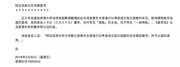 3月30日,特区政府发表声明表示,对戴耀廷相关言论"感到震惊,并予以强烈谴责"。特区政府重申,任何有关"港独"的主张都不符合"一国两制"、《基本法》以及香港社会的整体和长远利益。