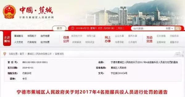 来自福建宁德市蕉城区人民政府网站消息,近日,蕉城区人民政府发布了关于对2017年4名拒服兵役人员的处罚通告,其中每人罚款人民币五万元整,户籍栏注明“拒服兵役”。