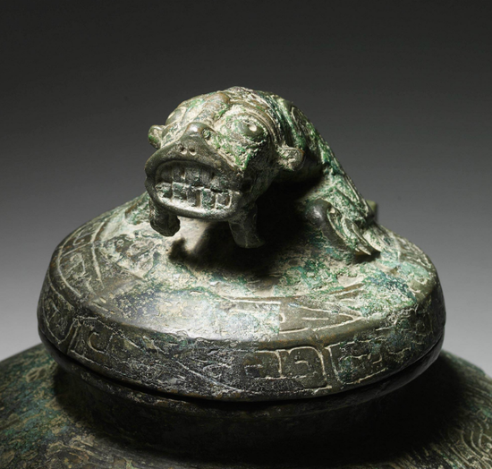 目前"蓥"类青铜器已知仅存世七件,除"虎蓥"和另一件"蓥"现身拍场,其余五件均为博物馆收藏,实属罕见。这件"虎蓥"因其器盖和出水口的老虎造型而得名。老虎在中国被看作动物之王和能防御邪恶力量最强大的动物。