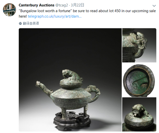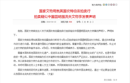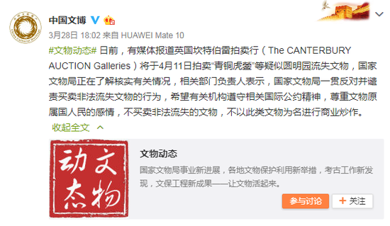 国家文物局官方微博@中国文博3月28日曾就此事发表声明称,日前,有媒体报道英国坎特伯雷拍卖行(The CANTERBURY AUCTION Galleries)将于4月11日拍卖"青铜虎蓥"等疑似圆明园流失文物,国家文物局正在了解核实有关情况,相关部门负责人表示,国家文物局一贯反对并谴责买卖非法流失文物的行为,希望有关机构遵守相关国际公约精神,尊重文物原属国人民的感情,不买卖非法流失的文物,不以此类文物为名进行商业炒作。