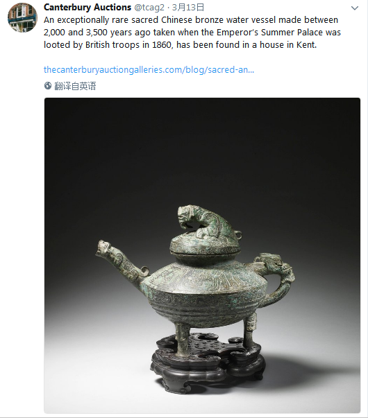 今天(4月10日),国家文物局再发《关于英国坎特伯雷拍卖行拍卖疑似中国圆明园流失文物事的声明》,强烈谴责坎特伯雷拍卖行行为,并呼吁共同抵制疑似非法流失文物拍卖。