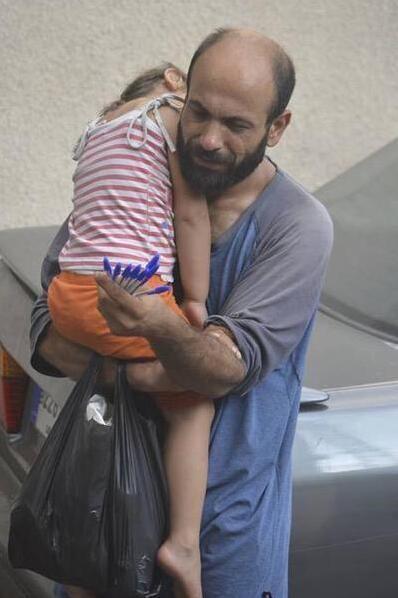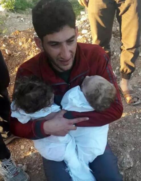 ▲父亲抱着遭毒气杀害的龙凤胎强忍泪水。