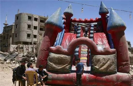 ▲儿童在充气城堡里玩耍庆祝开斋节。