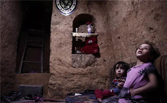 ▲当地民众躲在自制的地下“防空洞”中躲避空袭。
