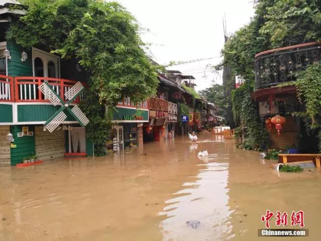 7月2日,桂林漓江上游及阳朔县普降暴雨,阳朔县城内涝严重,多处交通中断。