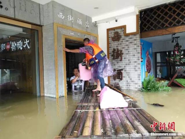 “地球村”阳朔西街被淹,被困游客和商户乘竹筏出行,目前阳朔所有景区临时关闭。