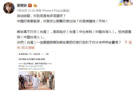 日前,刘乐妍还因绿媒对大陆与印度发生边界纠纷的报道,斥责该媒体“公开帮印度加油,是台独”,“解放军不打你(台独),是怕误伤我(中国台湾人)”。