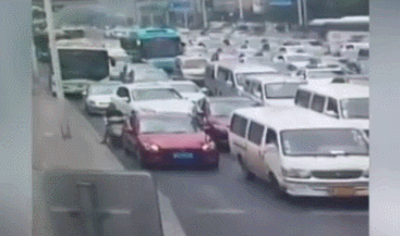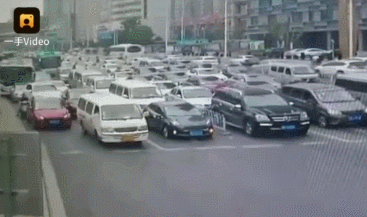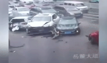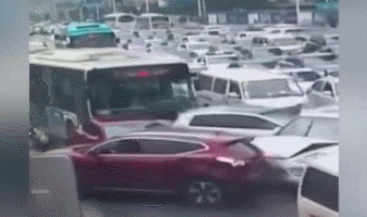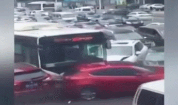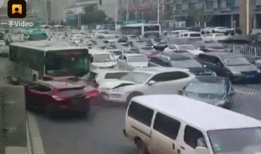 突然,357路公交车朝前撞去,很快,前面的车被撞得乱成一团。公交车将前边的车辆推移了数十米,才停下。