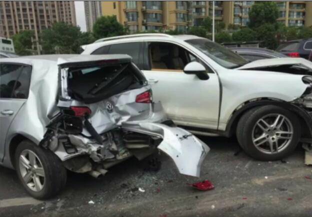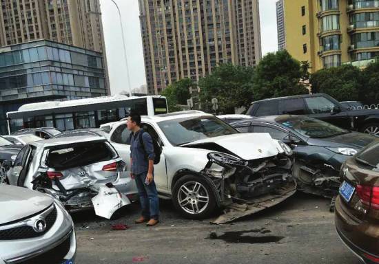 其中一辆白色保时捷卡宴受损严重。回想起事发时的情形,车主吴先生仍心有余悸:“当时我们都停在红绿灯路口,突然后面一股很大的力强行推着我的车往前走,踩刹车都没用,前面的几辆小车也只能遭殃了。”