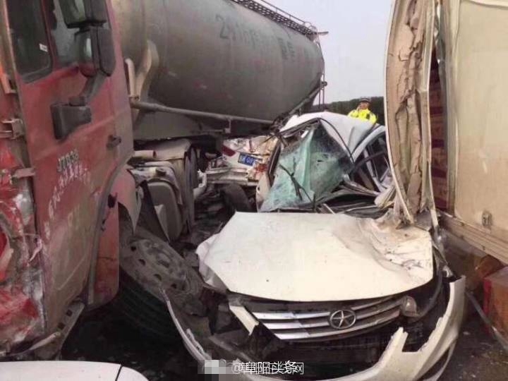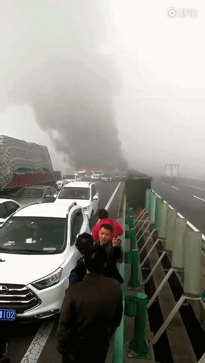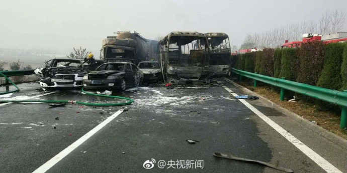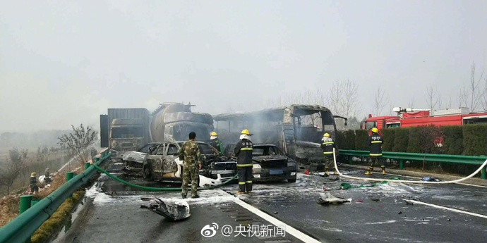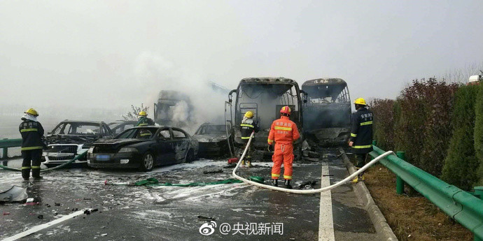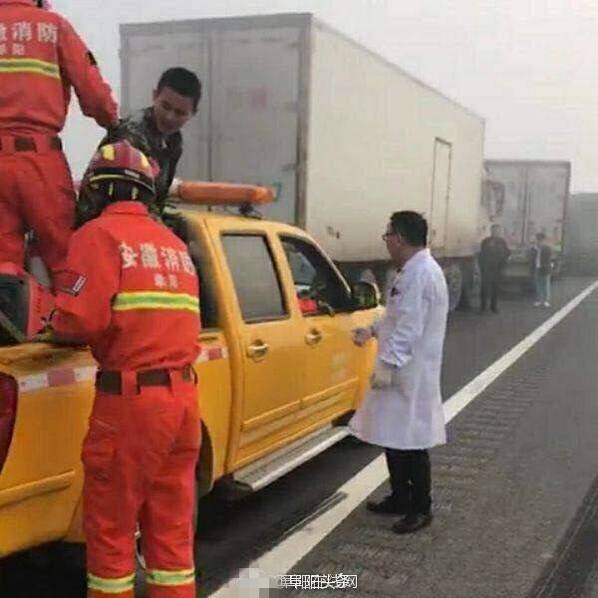 受大雾影响,2017年11月15日7时50分,阜阳公安消防支队指挥中心接到报警:位于颍上服务区G63高速往合肥方向2公里处发生连环车祸。据现场反馈,30余辆车连环相撞,有1处着火点,4辆车起火(2辆客车、1辆物流车、1辆水泥槽罐车)。